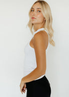 This season’s must-own layering staple, the Eva Tank, is a fitted ribbed knit in a cotton-spandex blend finished with a high crew neckline for a clean look. It’s a timeless style that works with just about everything in your wardrobe.
