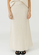 Elevate your wardrobe with Studio Nicholson's Rye Skirt in Cream. Made with a 'fabric first' philosophy, this skirt boasts a textured hand feel from slub cotton bouclé yarns. The elasticated ribbed waistband, exposed side seams, and fringed hem add a touch of uniqueness to this must-have piece. Pair with the matching Fray Top.