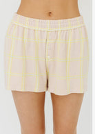 Elevate your loungewear collection with the Picnic Plaid Short. Featuring a 3-color plaid pattern and three button placket detail. These shorts are lightweight and soft, making them perfect for everyday wear.