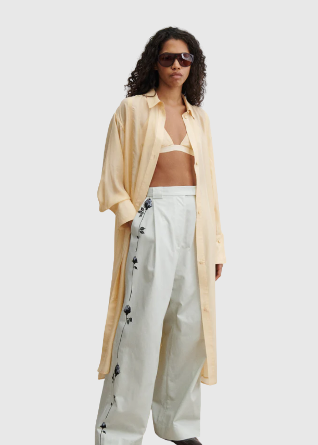 Cut from smooth silk and softly washed for an even more fluid hand, this midi shirt dress moves with quiet confidence. The fabric’s subtle sheen catches the light just enough, highlighting its natural drape and refined finish. A classic point collar and full button front nod to traditional shirting, while dropped shoulders and a relaxed, straight silhouette lend an effortless ease. Long sleeves are finished with structured button cuffs for a tailored touch, and discreet side slits allow for graceful movement.