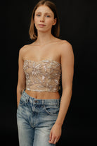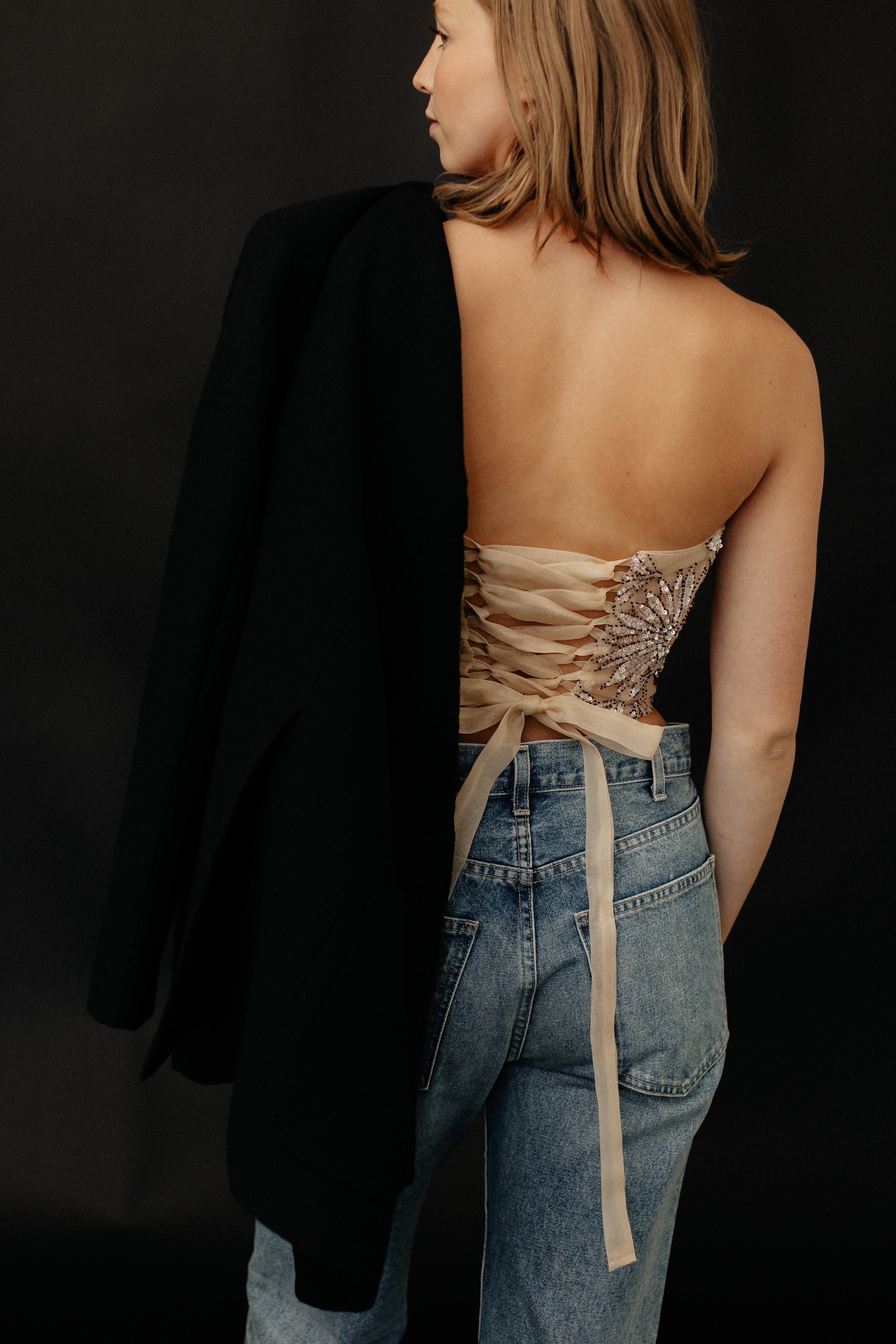 This one-of-a-kind corset is made from hand-beaded mesh and is lined in 100% silk organza for a luxurious and comfortable fit. Adjust to your size with the silk charmeuse tie!
