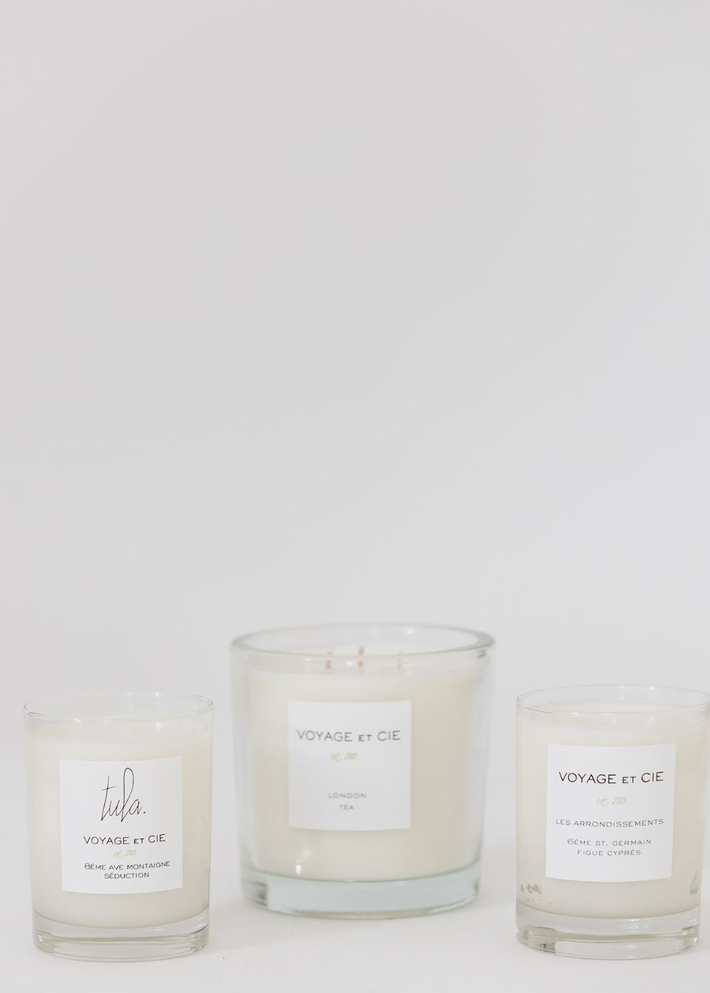The Tea Candle from Voyage Et Cie features a tranquil combination of orange, almond, osmanthus, carnation, lily sandalwood, honey and amber musk.