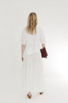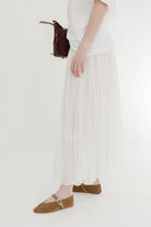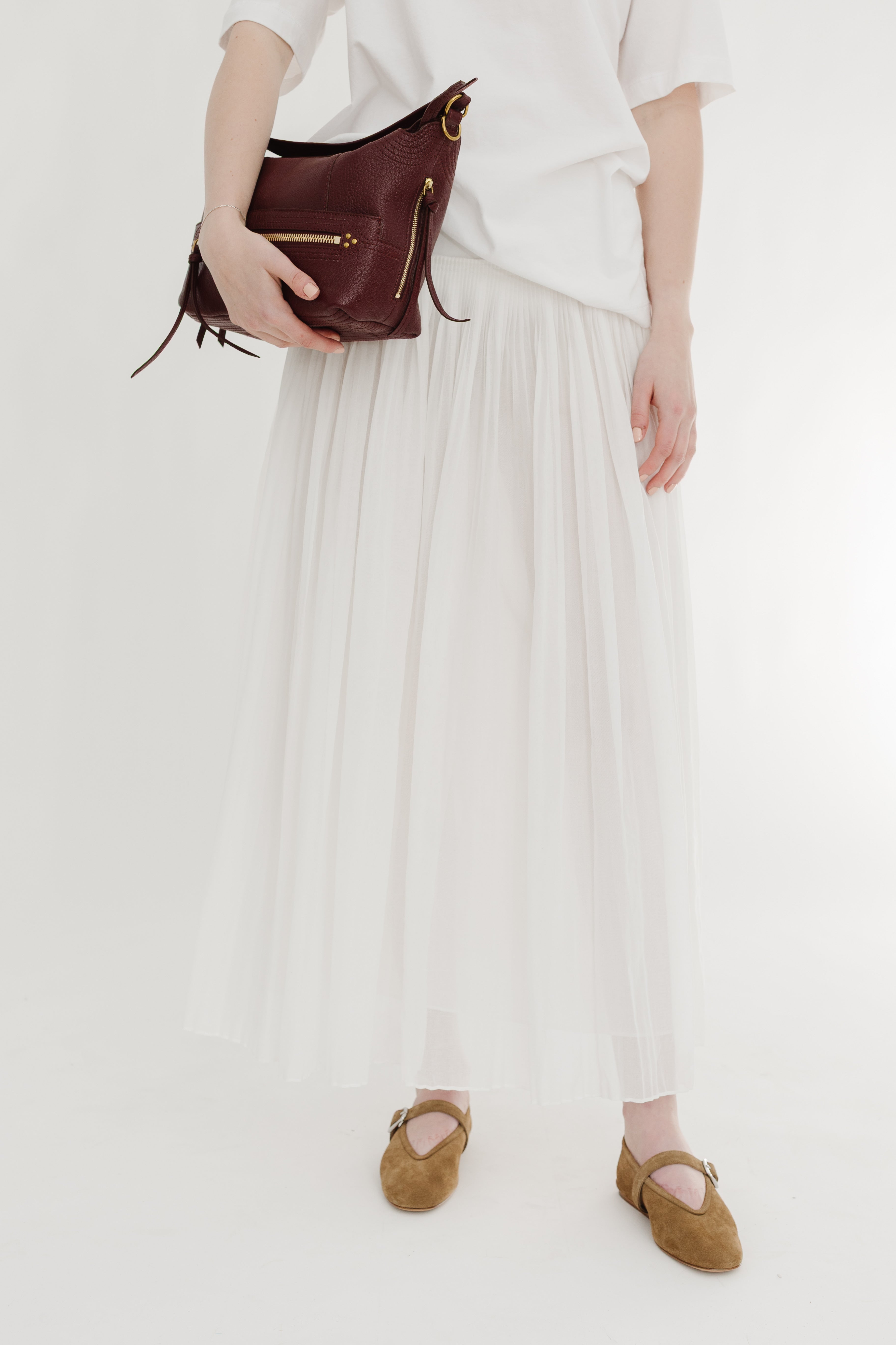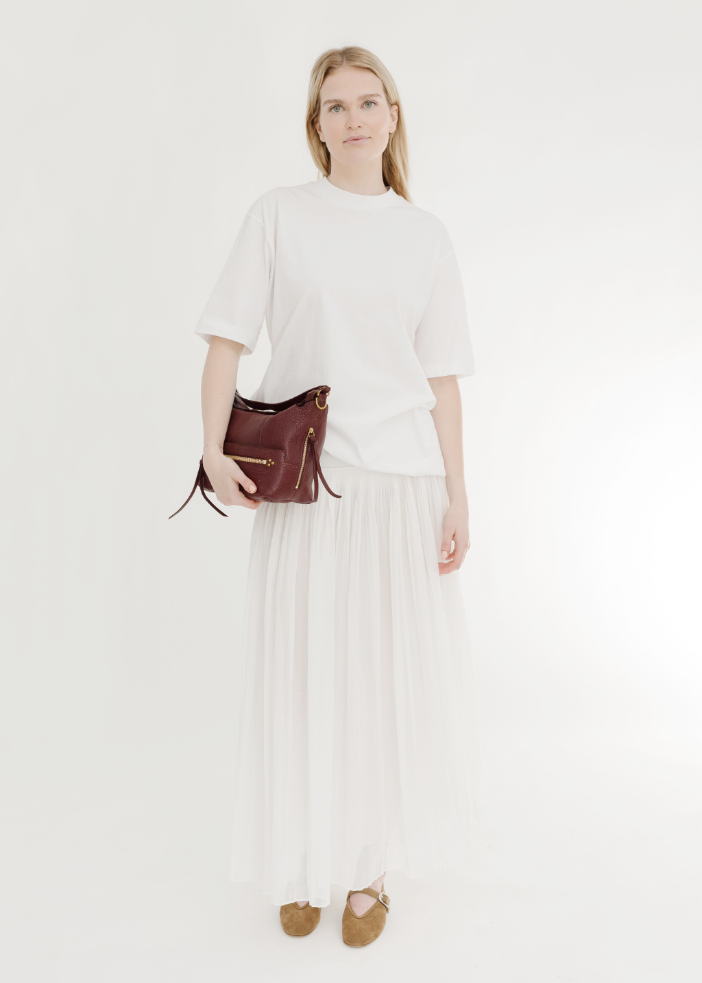 This signature maxi skirt is designed with a wide, fitted waistband that gives way to soft pleats in airy muslin. The silhouette moves with ease while maintaining a sense of structure at the waist. It's finished with a discreet blind zip closure for a clean, seamless look day-to-night.