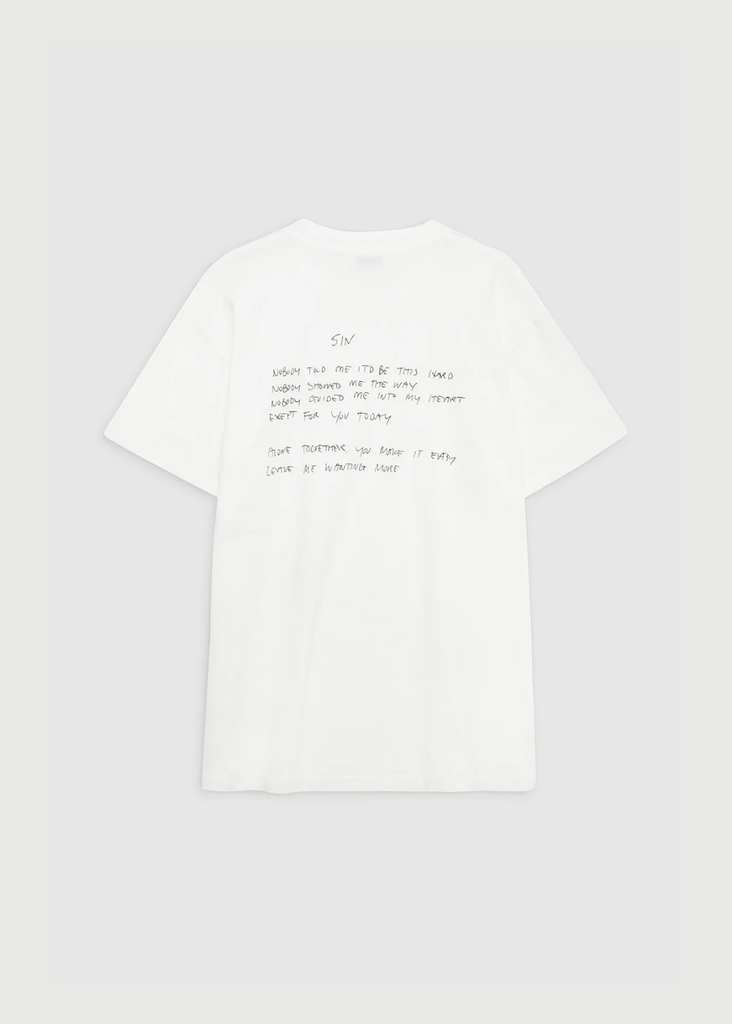The Walker Tee Lyrics is crafted from lightweight 100% cotton jersey in a soft ivory wash and features a handwritten graphic at the left chest, with bold “Sin” lyrics from Anine’s album THERAPY screen printed across the back. Designed with an oversized fit, it blends everyday comfort with a personal, artistic edge.