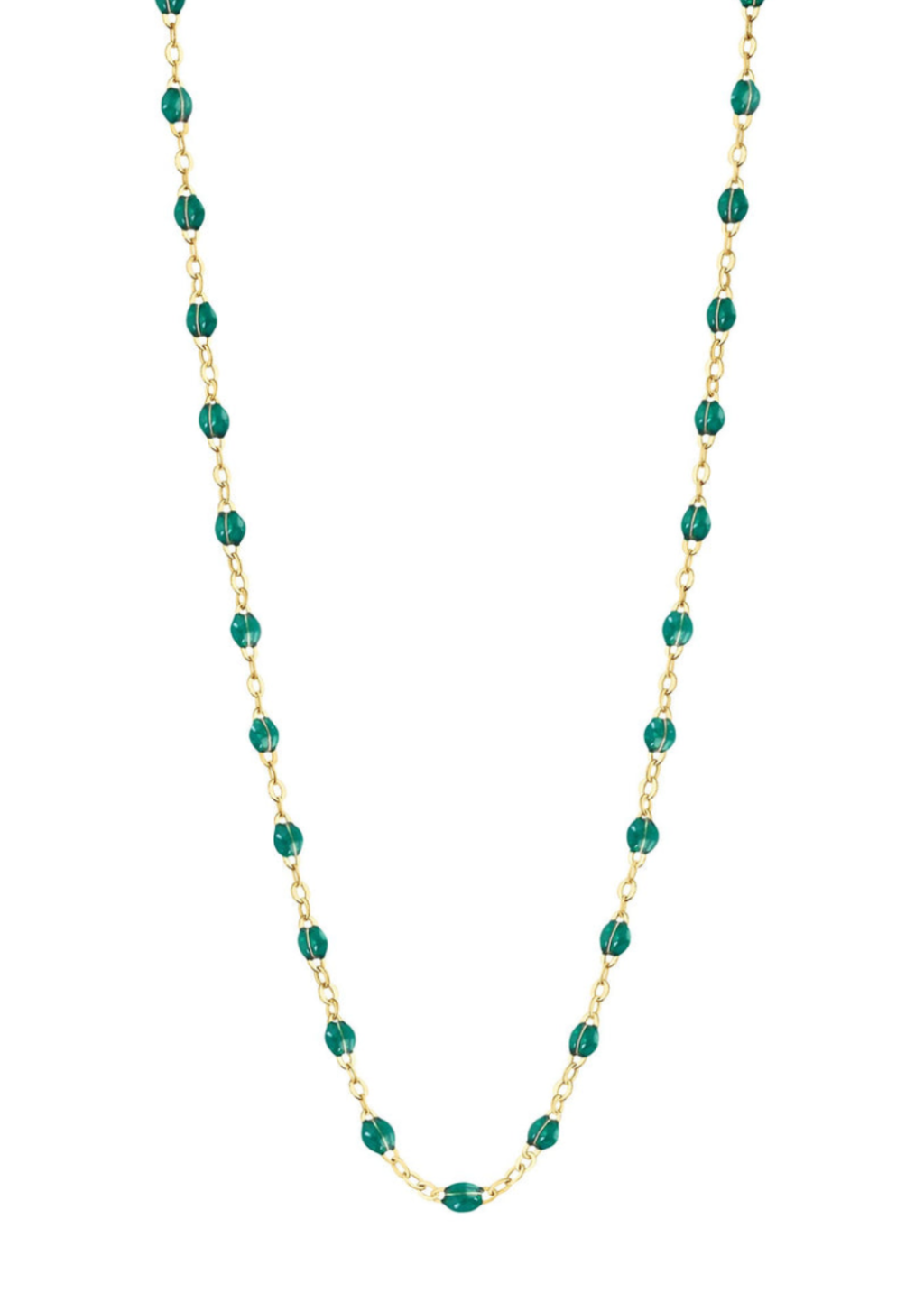 The Classic Gigi Necklace embodies the spontaneity and hope that life has to offer. Features 18 karat yellow gold and unique turquoise jewels for a simple, everyday look. Layer with multiple colors, pair with a Gigi bracelet or add a pendant to create a more unique piece.