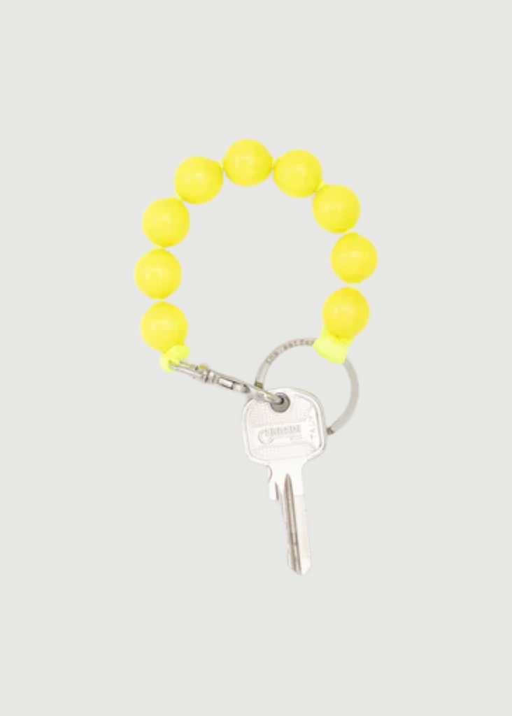 This beaded keychain with elastic band features threaded wooden beads for a fun and versatile accessory that can also double as a bag charm or bracelet.