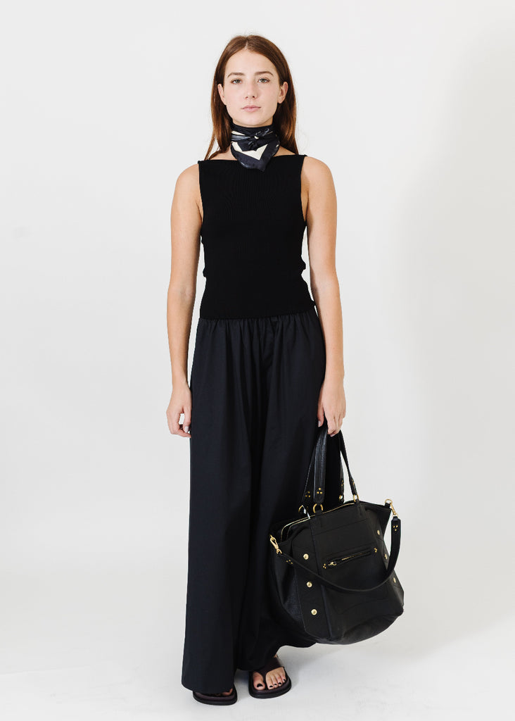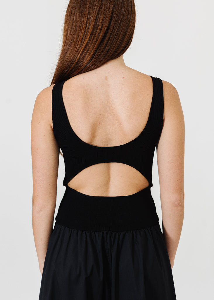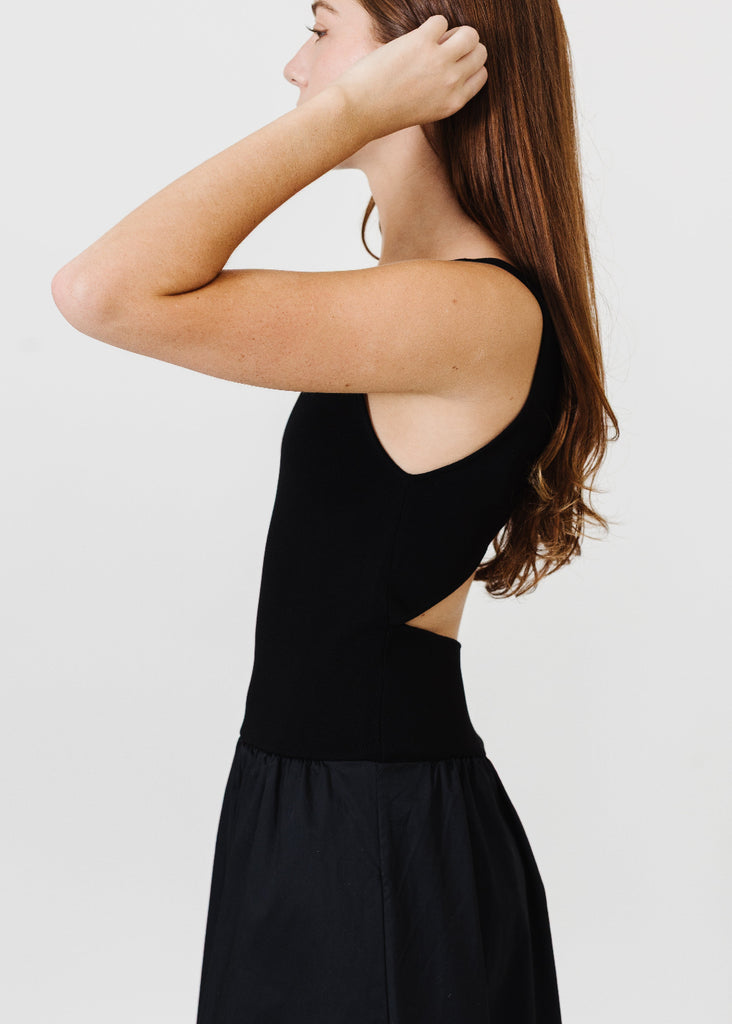 Elegant and effortless, the Bateau Cut Out Dress features a refined silhouette with understated cut-out detailing. A sculpted knit bodice offers structure through the top, while the crisp poplin skirt falls into a flowing maxi length. Designed to move seamlessly from day to evening, this versatile piece embodies modern femininity with a minimalist edge.