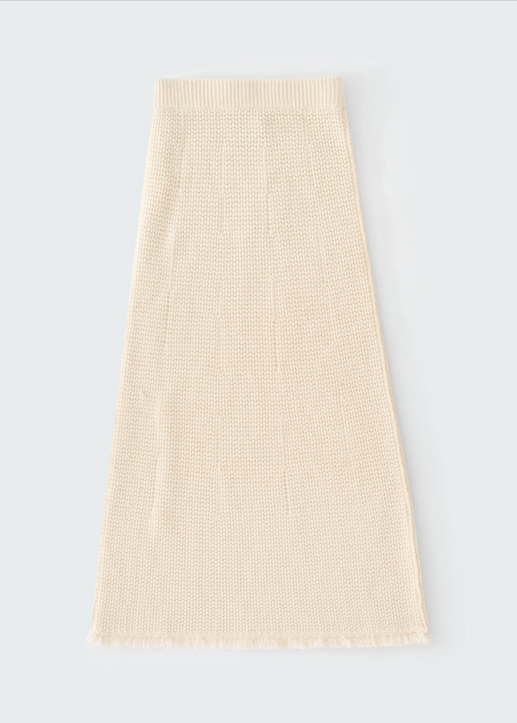 Elevate your wardrobe with Studio Nicholson's Rye Skirt in Cream. Made with a 'fabric first' philosophy, this skirt boasts a textured hand feel from slub cotton bouclé yarns. The elasticated ribbed waistband, exposed side seams, and fringed hem add a touch of uniqueness to this must-have piece. Pair with the matching Fray Top.