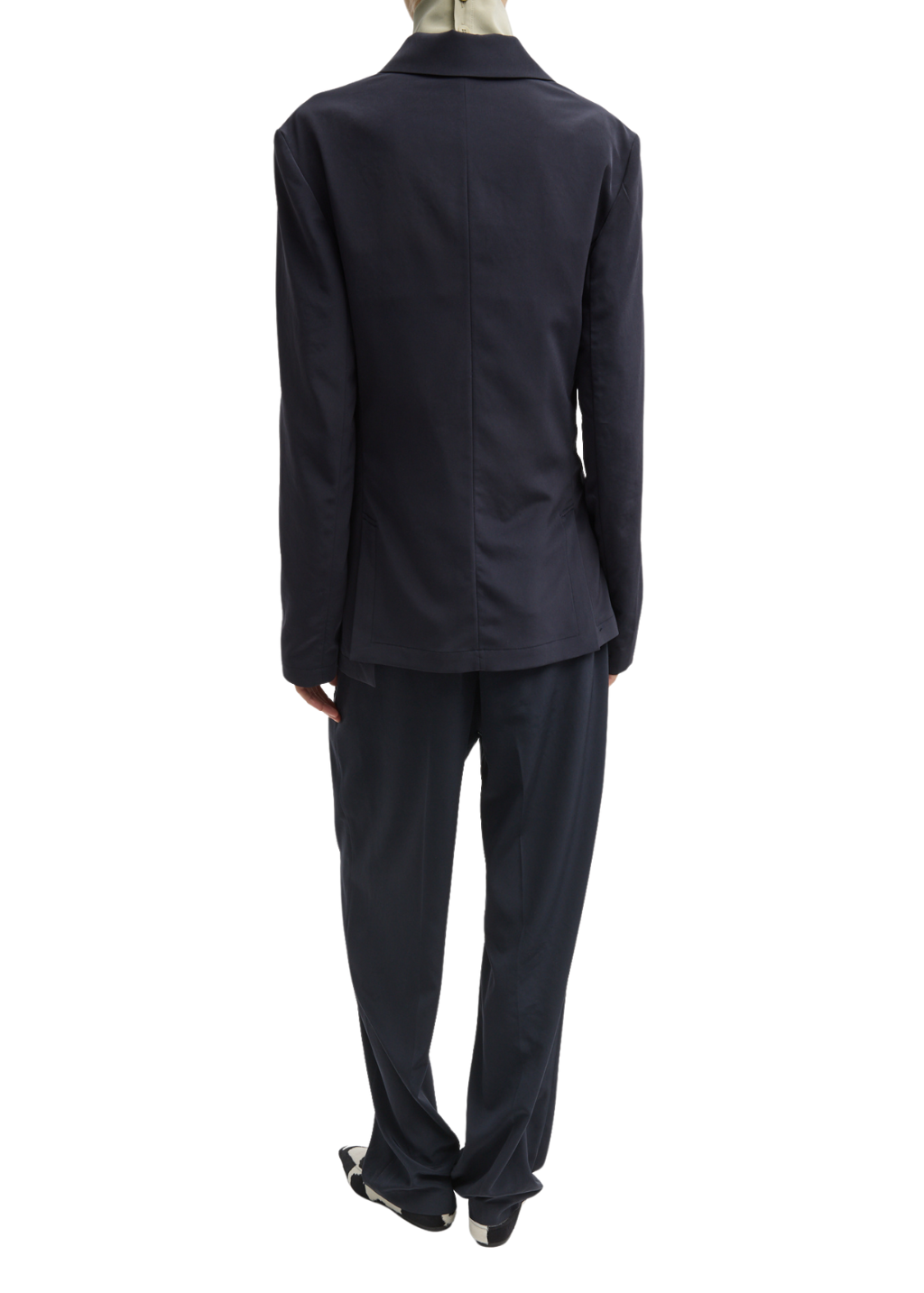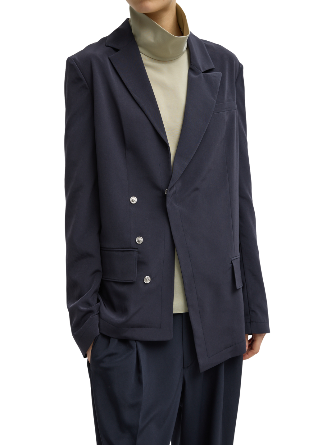 The Tibi Asymmetrical Wrap Blazer in Navy. Crafted from lightweight Japanese suiting, it offers a soft touch and natural drape that moves with you. The playful wrap design and off-center snap closure add a unique twist to classic tailoring. Dress it up with matching trousers or keep it casual with your favorite jeans for a polished look that’s anything but ordinary.